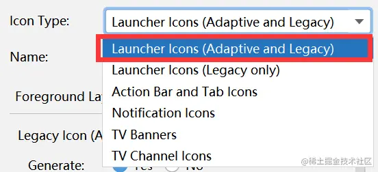 - 在Icon Type 中, 选择Launcher Icons (Adaptive and Legacy)。