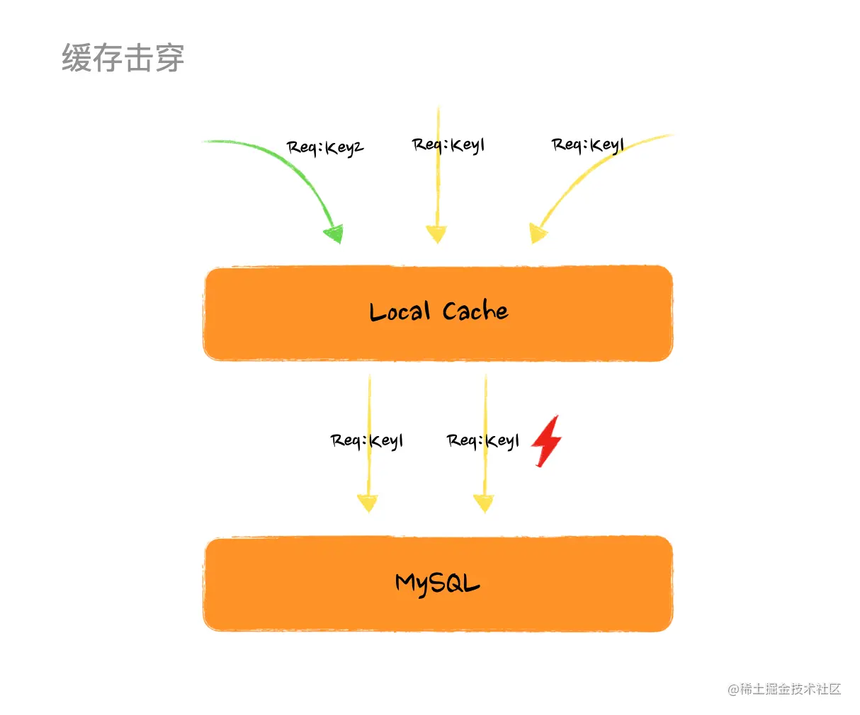 举个简单的例子,某个时刻有 100 个请求同时请求 KEY_25487 这个缓存项,而不巧这个缓存项刚好失效了,那么这 100 个线程(如果有这么多机器和流量的话)就会同时从 DB 加载这个数据,很可怕的点在于就算某一个线程率先获取到数据生成了缓存项,其他的线程还是继续请求 DB 而不会走到缓存。