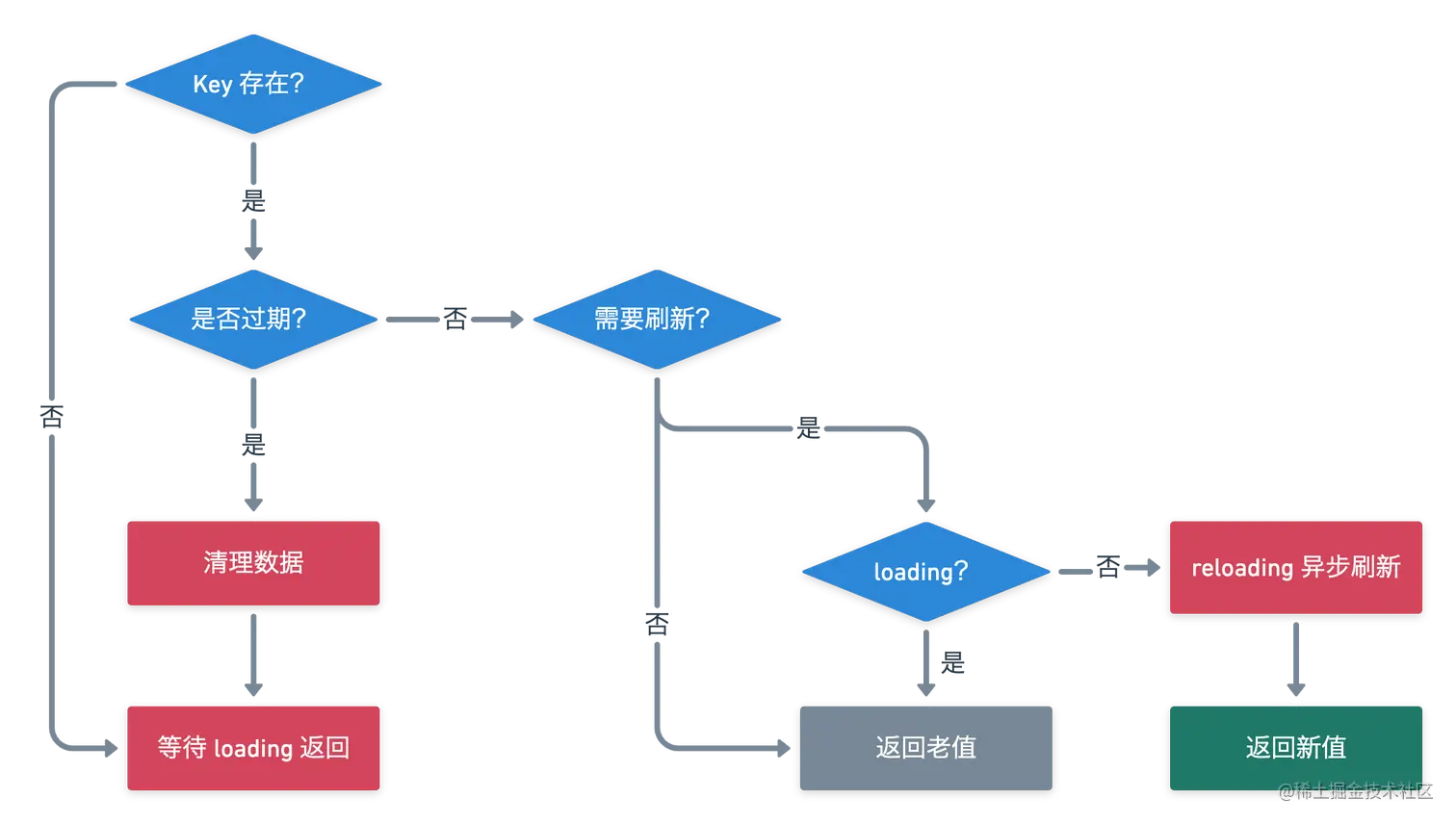 简单回顾下 Get 的流程以及在每个阶段做的事情,返回的值。首先判断缓存是否过期然后判断是否需要刷新,如果过期了就调用 loading 去同步加载数据(其他线程阻塞),如果是仅仅需要刷新调用 reloading 异步加载(其他线程返回老值)。
