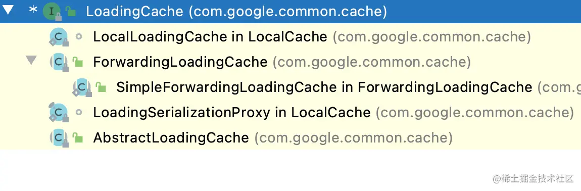 先整体看下 Cache 的类结构,下面的这些子类表示了不同的创建方式本质还都是 LocalCache