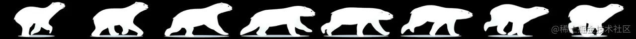 基本思路:如下图所示一张图片上有8个不同状态的大熊,每个大熊的宽度大约是160px,我们定义一个宽为160px的div盒子,然后把这个图片作为盒子的背景图片,然后通过动画控制背景图片的位置,每次向左移动一个大熊的的位置,所以8个大熊(背景图片的总宽度)分为8次移动结束。这里需要制定animation-timing-function的属性为steps(8),这样连续起来就像大熊在奔跑一样。然后我们再定义一组盒子移动的动画。让盒子从左边移动到右边。多组动画用逗号分隔。