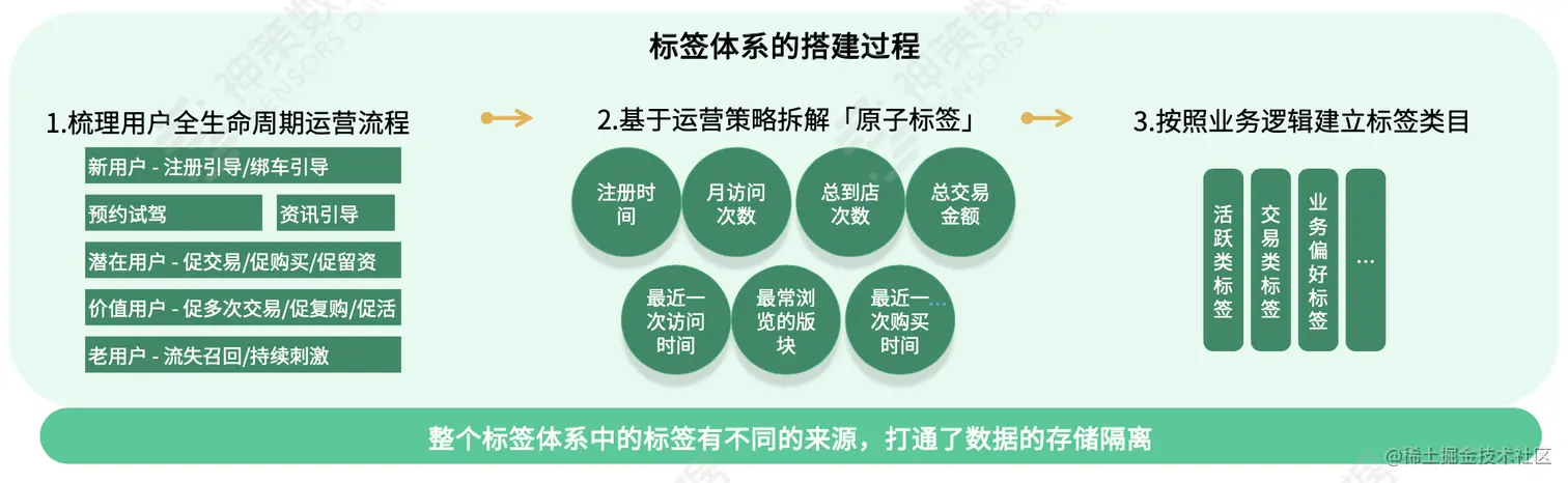第三步,有了这些原子标签后,再将它们按照业务逻辑建立标签类目,从而生成一个个类似于活跃类标签、交易类标签或是业务偏好类标签等。然后再结合用户在整个私域触点的预制属性信息的填写,将整个用户标签体系进行完善的搭建和组合。