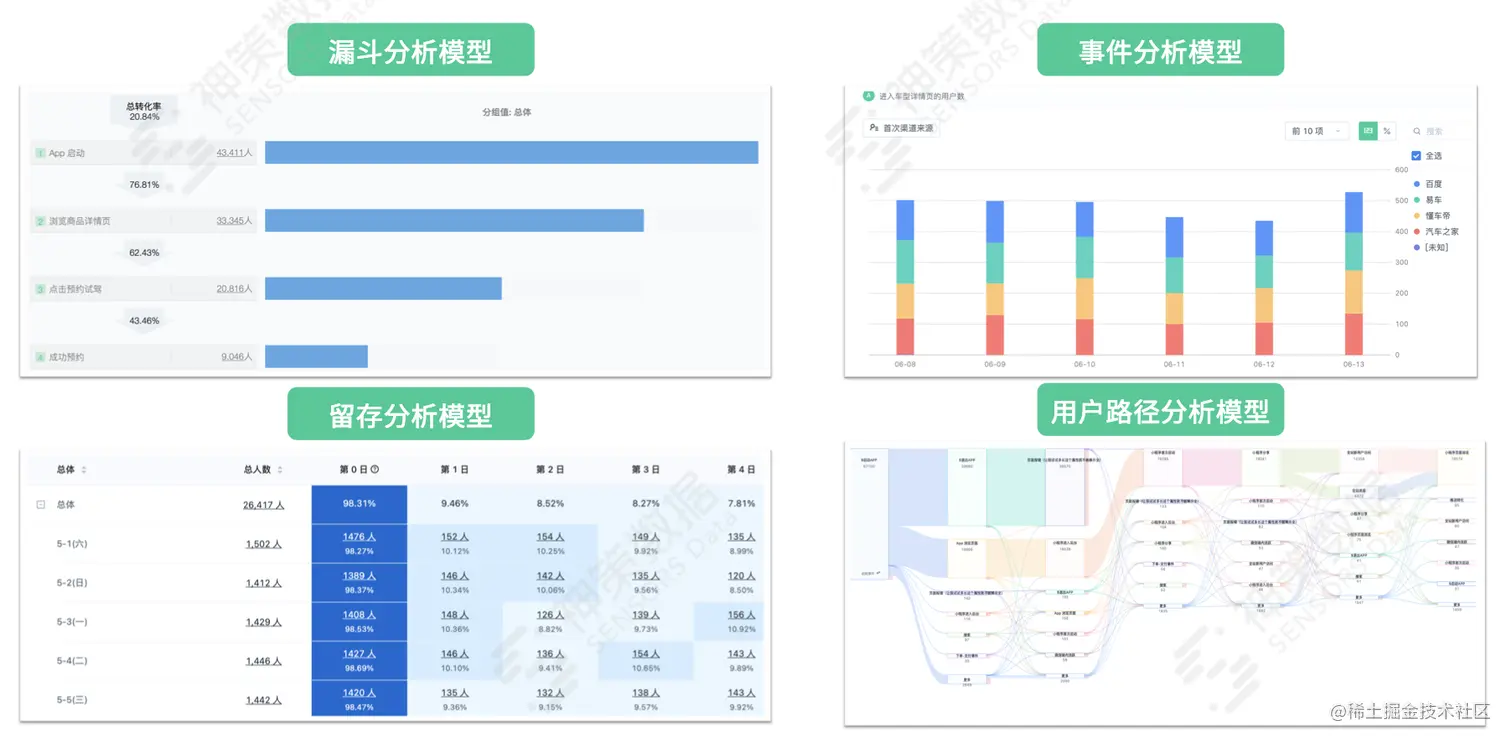神策分析配置了事件分析、留存分析、漏斗分析、分布分析等十多个数据分析模型,同时支持指标和标签的自定义,分析完成后,还可以通过用户标签体系的搭建,进行用户画像的洞察。
