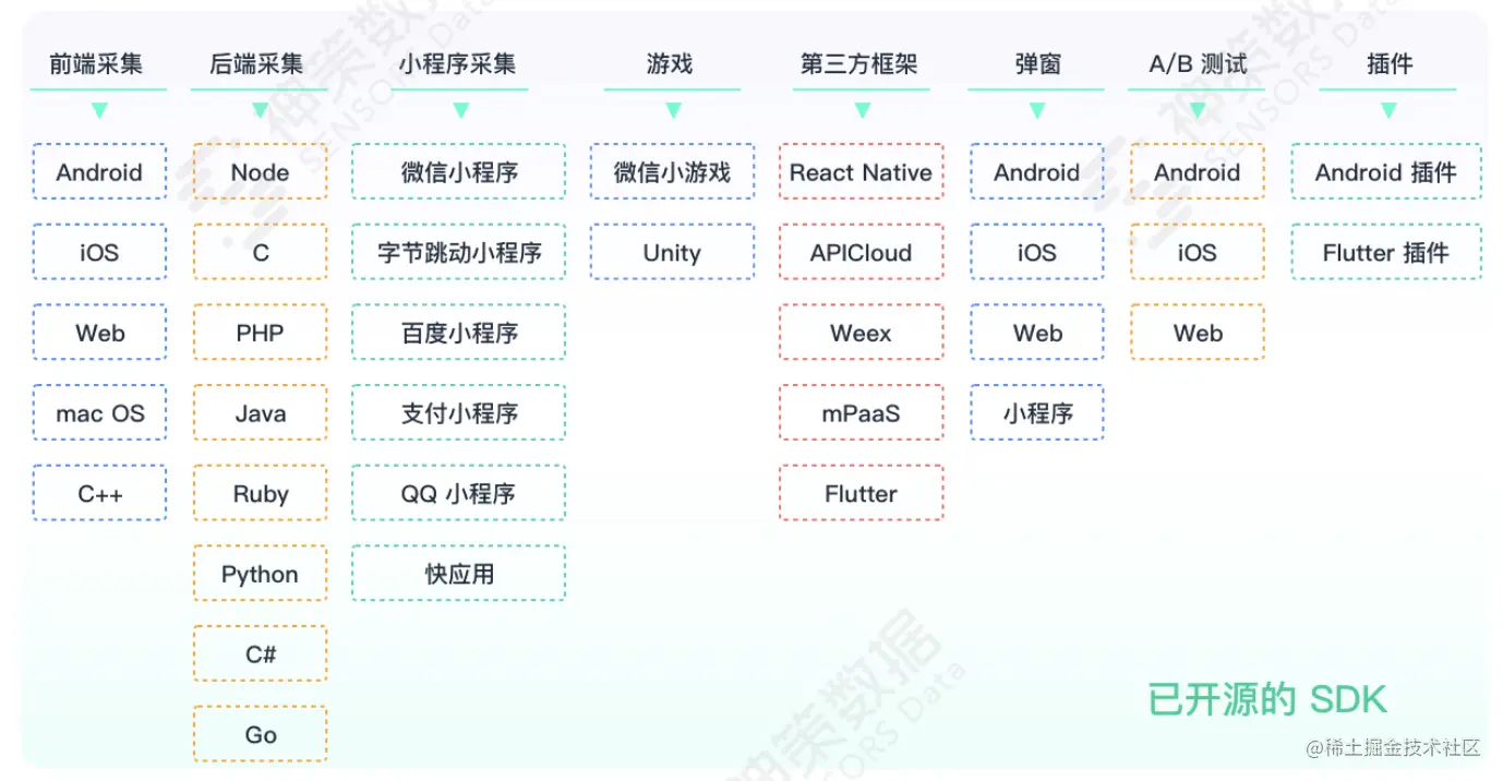神策数据兼具多种数据源的采集能力,可以进行安全、多维、实时的采集。目前有开源的 40 多种 SDK ,安全合规,打破数据采集的黑盒现象。