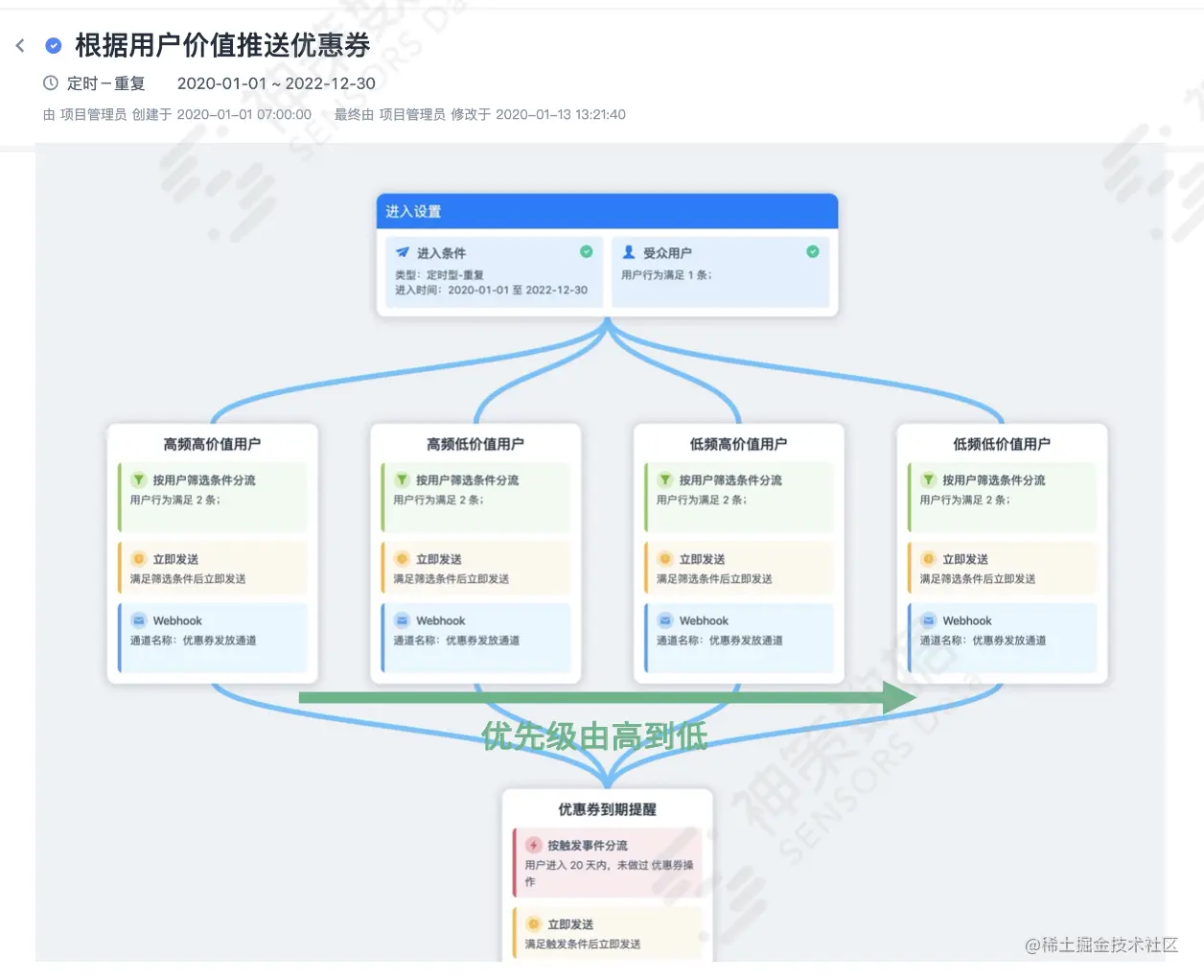 流程画布可以覆盖完整而复杂的业务场景,比如根据用户的价值推送优惠券,可以从高频高价值的用户到高频低价值的用户,按照优先级从高到低逐层进行发放。