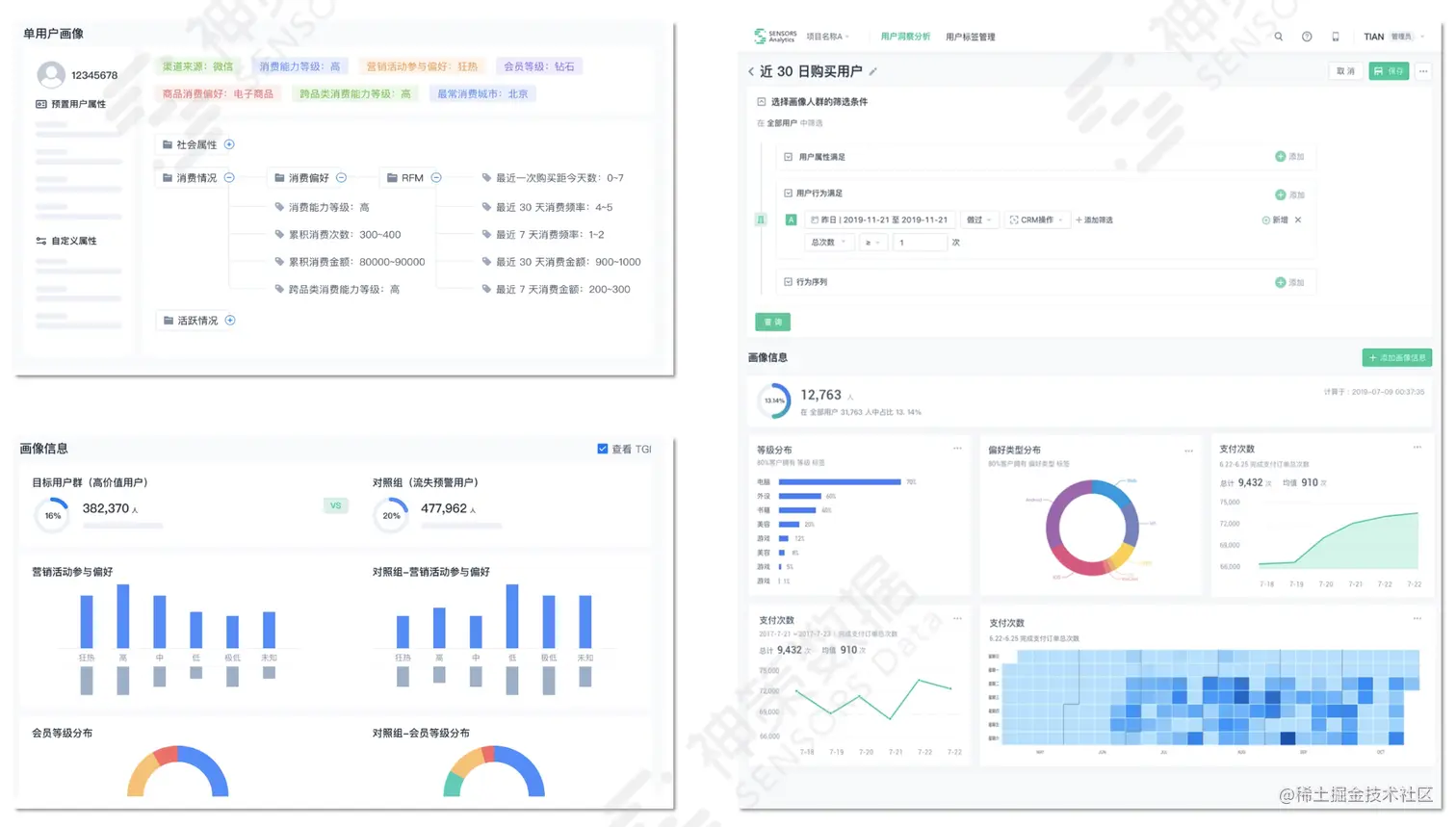 除了营销活动参与偏好之外,还可以做会员等级分布、社会属性等不同维度的对比分析,从而提供 360° 的用户(群)画像分析,洞察群体特征,指导下一步的营销策略。