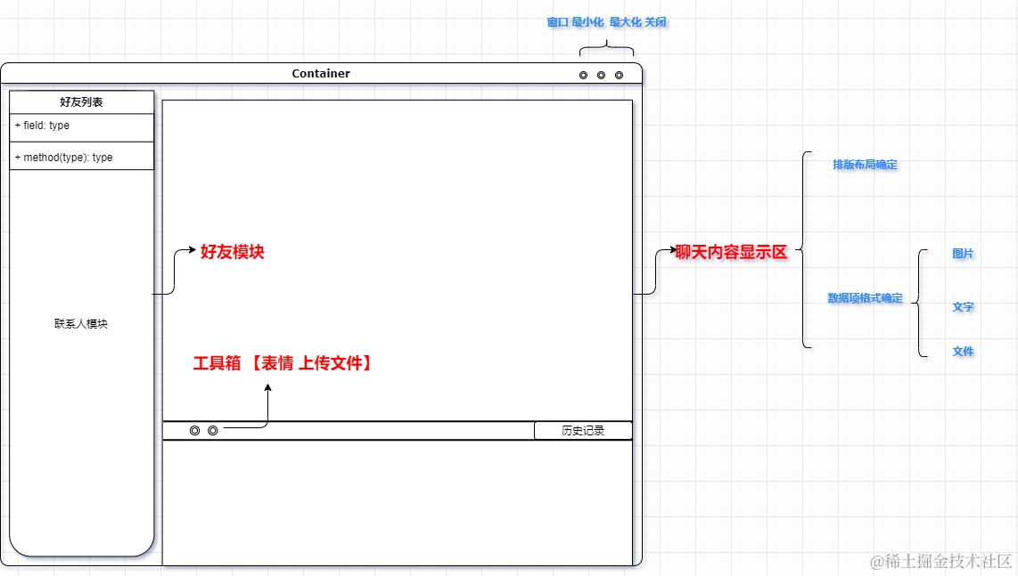 首先,我们要等待 UI 设计师 的设计稿 画出来, 然后根据 UI 设计师的 设计稿分析整体 聊天通讯 的结构,从view 结构 来 划分 应该 大体 包括哪些 component , 每个component 中 又包括哪些小的 component , 这样从 大 到 小 的方向将 设计稿 转化为 程序员视角的 component .