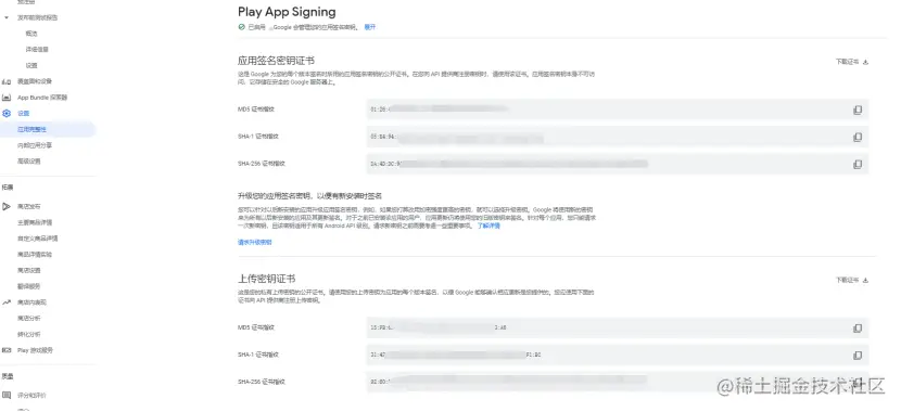如果应用签名偏好选择第一项则会出现不同的证书SHA1等也不同,因为谷歌会帮你重新签名一次。