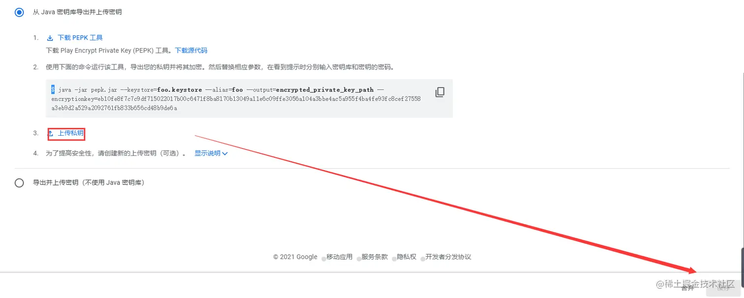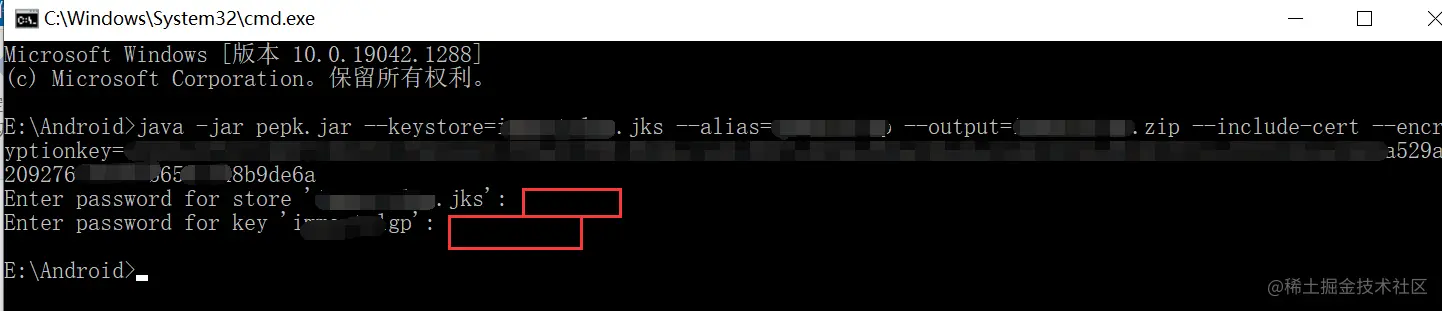 java -jar pepk.jar --keystore=demo.jks --alias=demogp --output=demo.zip --encryptionkey=eb10fe8f7c7c9df715022017b00c6471f8ba8170b13049a11e6c09ffe3056a104a3bbe4ac5a955f4ba4fe9xxxxxx(由谷歌提供)