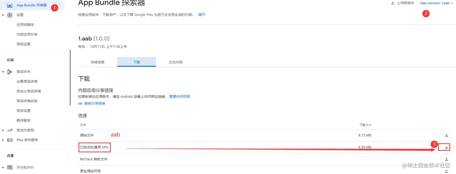 选中应用>App Bundle 探索器>下载>找到已签名的通用APK点击下载。如下图: