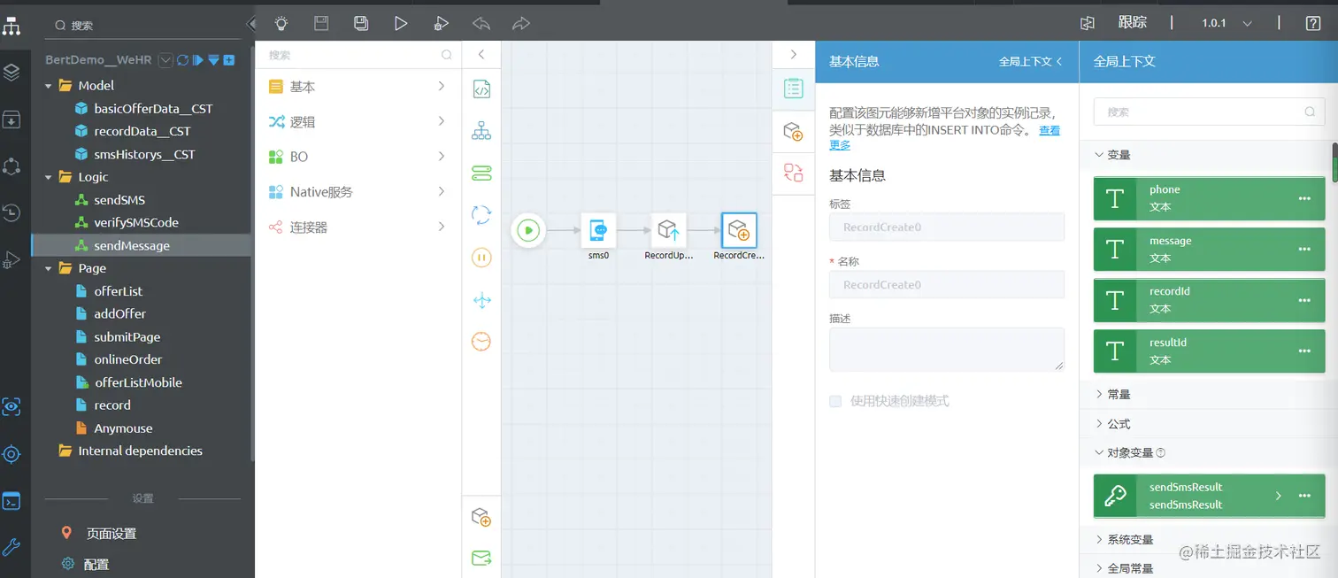 我的 Logic 目录下存放的主要是短信验证码和面试邀请短信发送的逻辑。sendSMS 实现的是短信验证码发送,入参是手机号,出参是发送短信的结果,并将短信发送记录写入smsHistorys__CST;verifySMSCode是用来校验短信验证码的,校验成功则会从smsHistorys__CST删除对应记录;sendMessage则是用来发送面试邀请短信的,当然也可以发送其他信息如简历不符合之类的,同时也会更新recordData__CST中的状态。