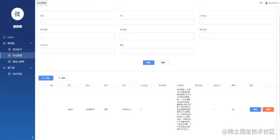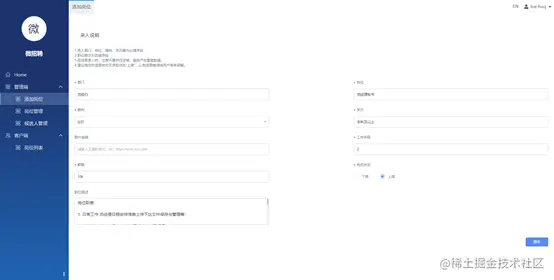 虽然 AppCube 中有完善的用户体系,鉴于此次开发是简单的模板开发,因此不涉及到用户体系的接入,后台管理界面以开发者身份的 Protal 页面为基础,配置上相应页面的菜单。如上图所示,默认的 Protal 页已经涵盖了登录、菜单栏等实现,我们只需关注业务的实现。在岗位录入页面中,用人需求部门可根据实际情况录入并发布岗位信息。
