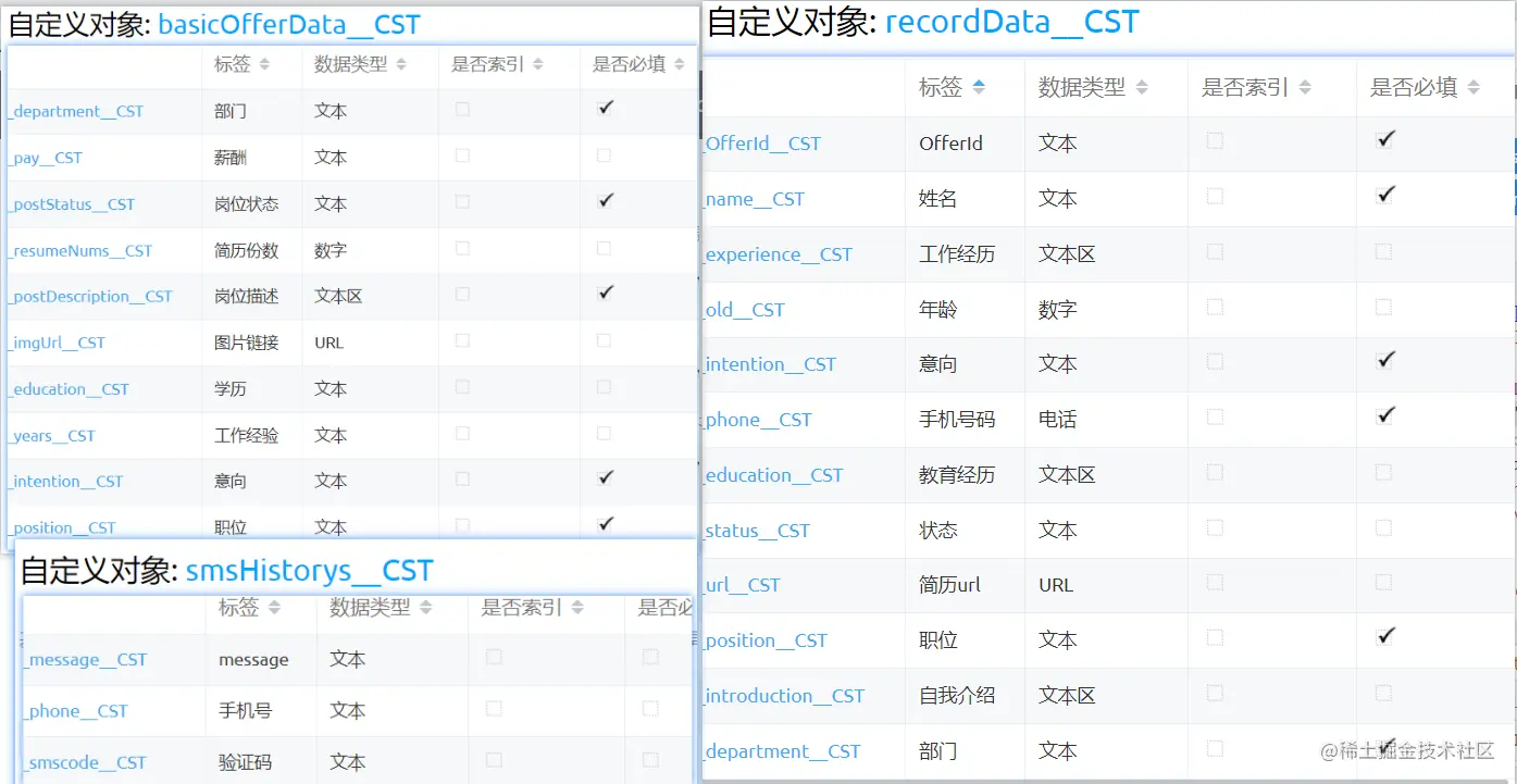 我的 Model 目录下存放的就是对象模型,也就是数据库表,这是我们开发之前就需要考虑的,由于平时工作中几乎接触不到数据库表设计,因此我的表设计就很随意了,basicOfferData__CST记录了岗位信息,recordData__CST记录了用户的提交信息,smsHistorys__CST记录了面试邀请短信记录.