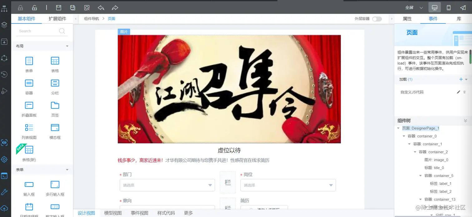 Appcube 的标准页面开发是最最基本的操作,基本上通过拖拉拽就能搭建一个页面,左侧有众多的组件可供直接使用,如果您具备代码开发能力还可以自定义开发组件。右侧的事件栏可编写自定义 JS 脚本,当然 AppCube 中也提供了大量的事件代码模板,基本复制过来修改一下就能直接使用。