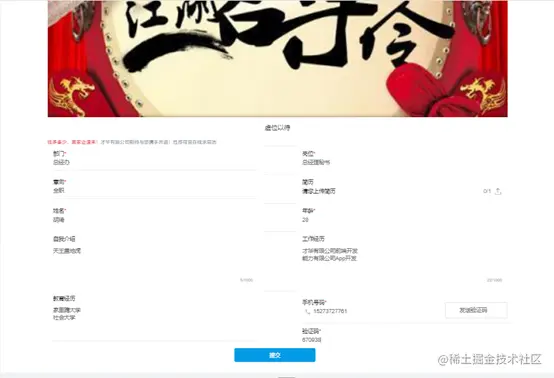 岗位申请页面实现了针对指定岗位的申请,同样的,这个页面也支持 PC 端和移动端的兼容。为了进一步减少开发工作量,该页面和岗位详情页共用,通过定义控制表单是否可填写和是否显示提交按钮的模型视图来区分表单提交页和详情页,在前端开发中这应该是常用的伎俩。