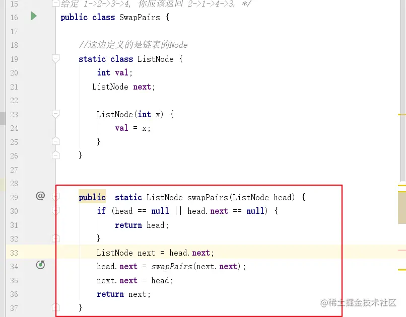 - 调用单元的逻辑:head 为空指针或者 next 为空指针,也就是当前无节点或者只有一个节点,无法进行交换