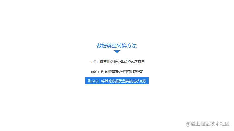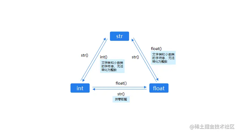 在上题中,widht与lenght变量已经是浮点类型,weight是字符串类型(可以用type(变量)来查看数据类型),因此打印前对将weight进行float(weight)转化即可。到现在为止,你已经知道了转换数据类型的方法了。下面,我们通过一张图小结一下这三个函数。