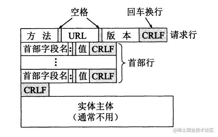 TCP 三次握手结束后确认数据传输可靠后,开始发送 HTTP 请求报文。 请求报文的结构如下图所示: