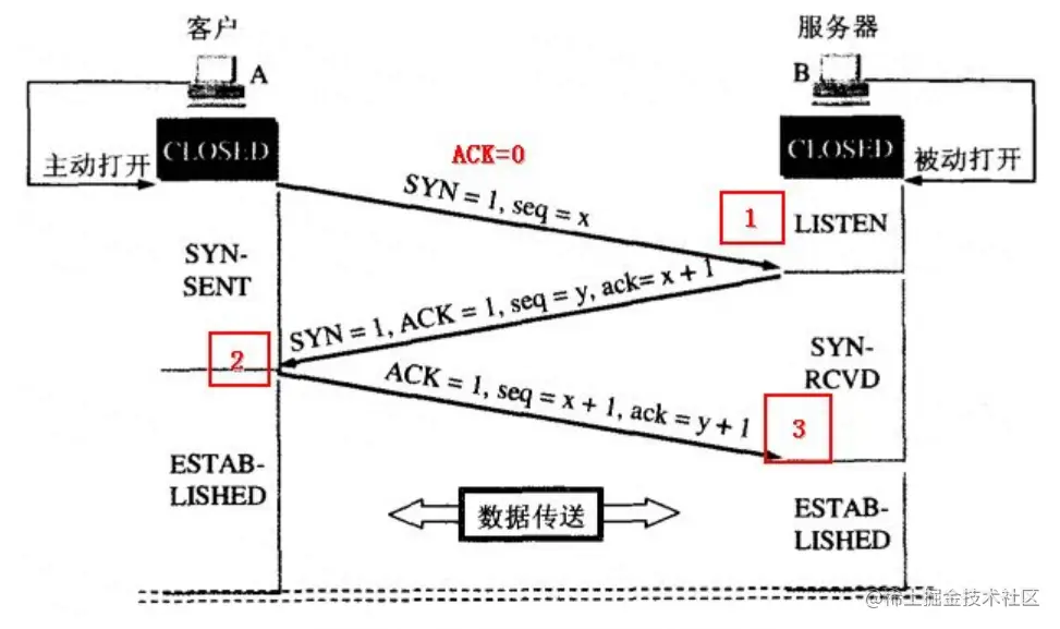 - 客户端发送 SYN=1的询问报文给服务器端,seq是n,进入 SYN_SENT 状态。