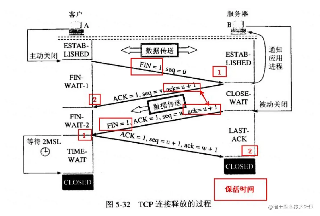 - 服务器通知应用程序关闭网络连接,应用程序关闭后通知服务器。服务器发送一个 FIN 给客户端 。