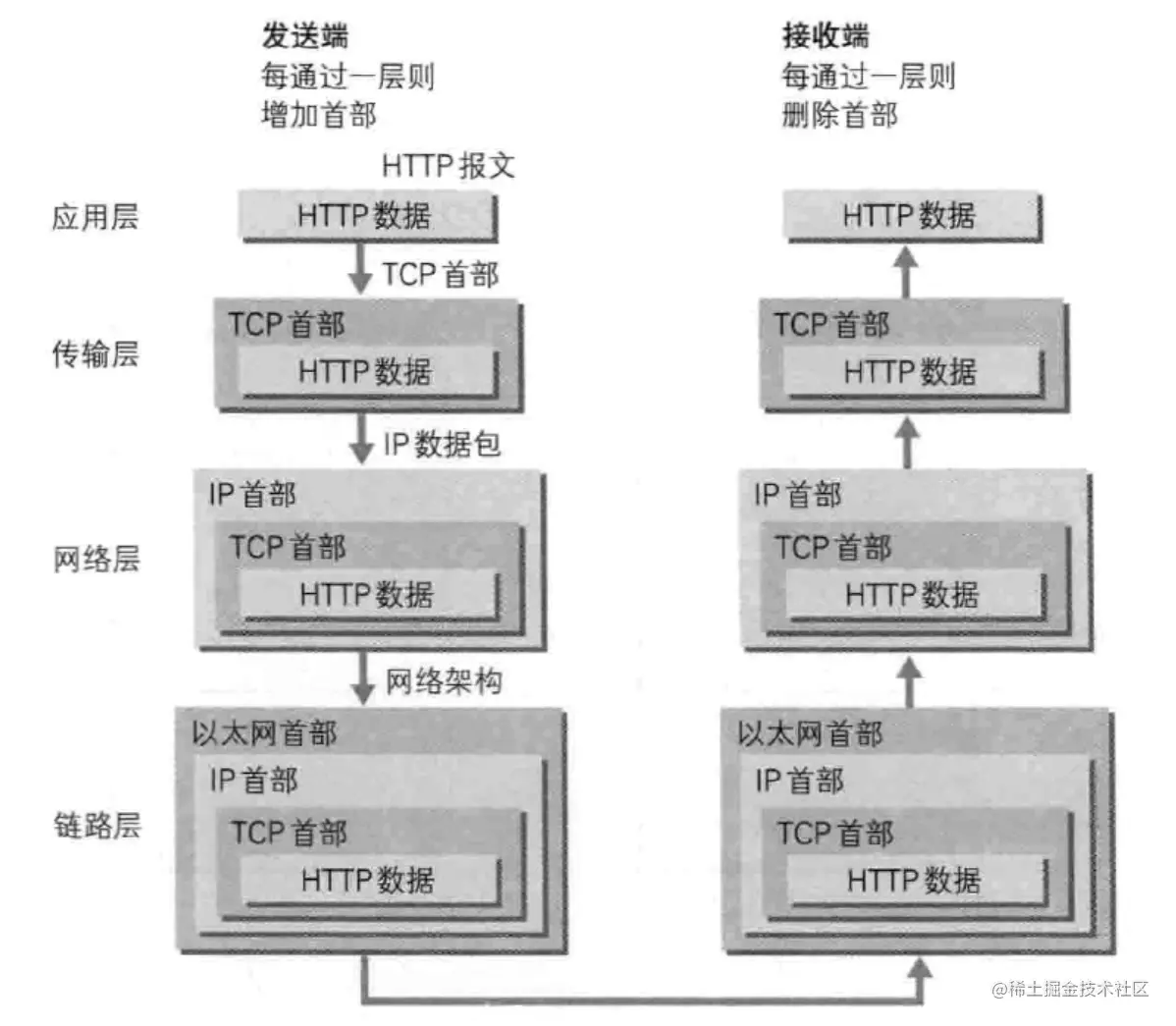 利用TCP/IP协议族进行网络通信时,会利用上述分层的顺序与对方进行通信,发送端从应用层发出命令往下走,而接收端则是从数据链路层收到数据往上走。