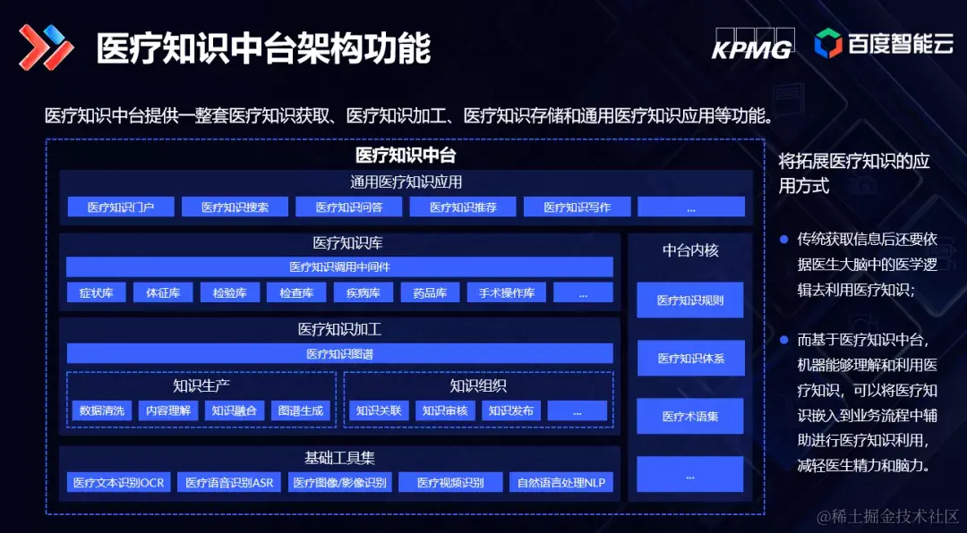 为推动知识中台在医疗领域的深入应用,百度灵医智惠联合毕马威发布了《医疗知识中台白皮书》。百度智慧医疗总经理刘军伟表示,百度持续发挥在自然语言理解、知识图谱等人工智能领域的技术优势,并且在医疗知识领域投入大量资源。医疗知识中台具备对医疗知识进行深度加工的能力,能够帮助医疗机构、医疗从业人员、医疗健康产业机构等获取权威、专业的医疗知识,满足快速搭建场景化应用的需要。白皮书的发布,意味着百度将沉淀累积的能力面向合作伙伴开放,同时也开始接受市场的检验。