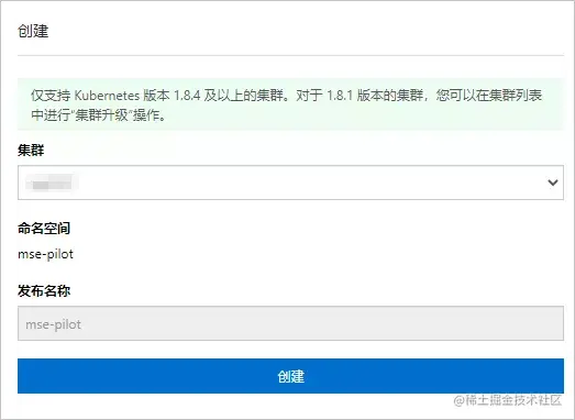 - 在 ack-mse-pilot 页面右侧集群列表中选择集群,然后单击创建。
