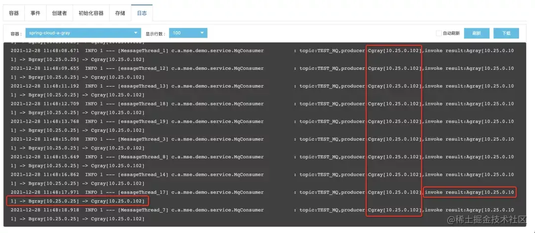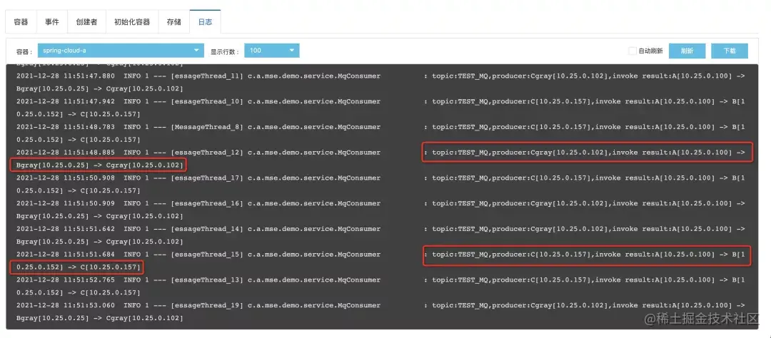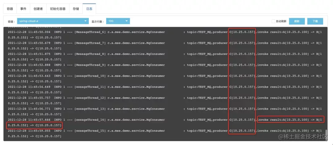 2021-12-28 10:58:50.301 INFO 1 --- [essageThread_15] c.a.mse.demo.service.MqConsumer : topic:TEST_MQ,producer:C[10.25.0.30],invoke result:A[10.25.0.32] -> B[10.25.0.152] -> C[10.25.0.30]