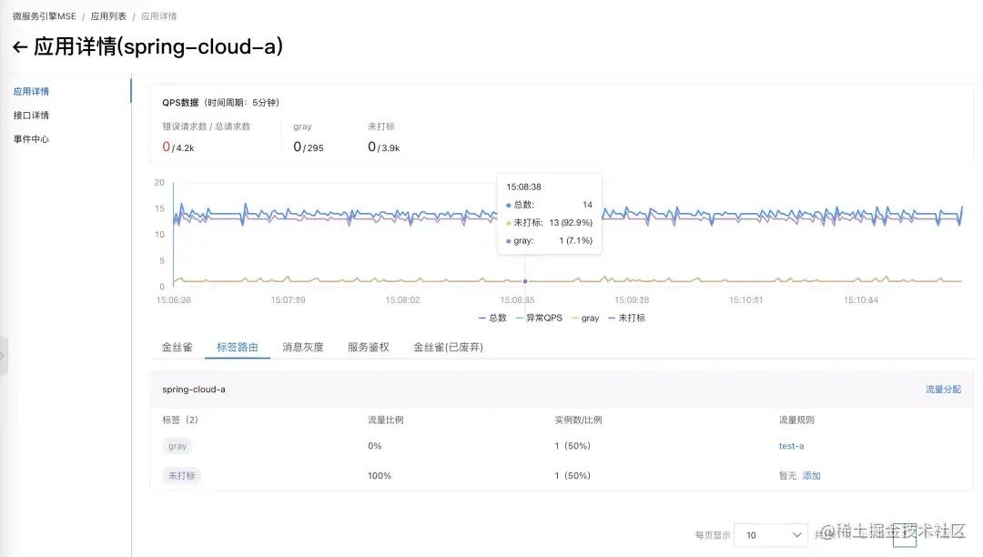 - 单击应用 spring-cloud-a 应用详情菜单,此时可以看到,所有的流量请求都是去往 spring-cloud-a 应用未打标的版本,即稳定版本。