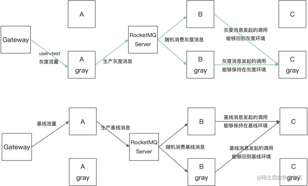 虽然绝大多数业务场景下对于消息的灰度的要求并不像 RPC 的要求得这么严格,但是在以下两个场景下,还是会对消息的全链路有一定的诉求的。