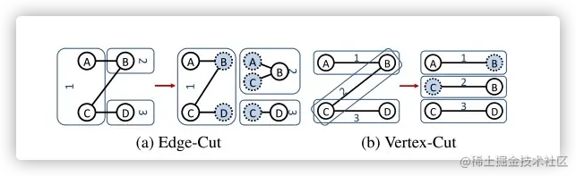 边分割:每个点的数据只会存储在一台机器上,但有的边会被打断分到多台机器上。 如图(a)所示,点 A 的数据只存放在机器 1 上,点B 的数据只存放在机器 2 上。对于边 AB 而言,会存储在机器 1 和机器 2 上。由于点 A 和点 B 分布在不同的机器上,在迭代计算过程中,会带来通讯上的开销。