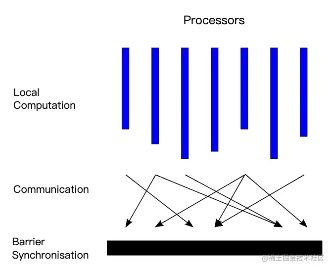 BSP 模型:BSP 模型的计算过程是由一系列的迭代步组成,每个迭代步被称为超步。采用 BSP 模型的系统主要有 Pregel、Hama、Giraph 等。 BSP 模型具有水平和垂直两个方面的结构。垂直上看,BSP 模型有一系列串行的超步组成。水平上看(如图所示),一个超步又分三个阶段: