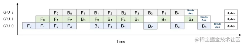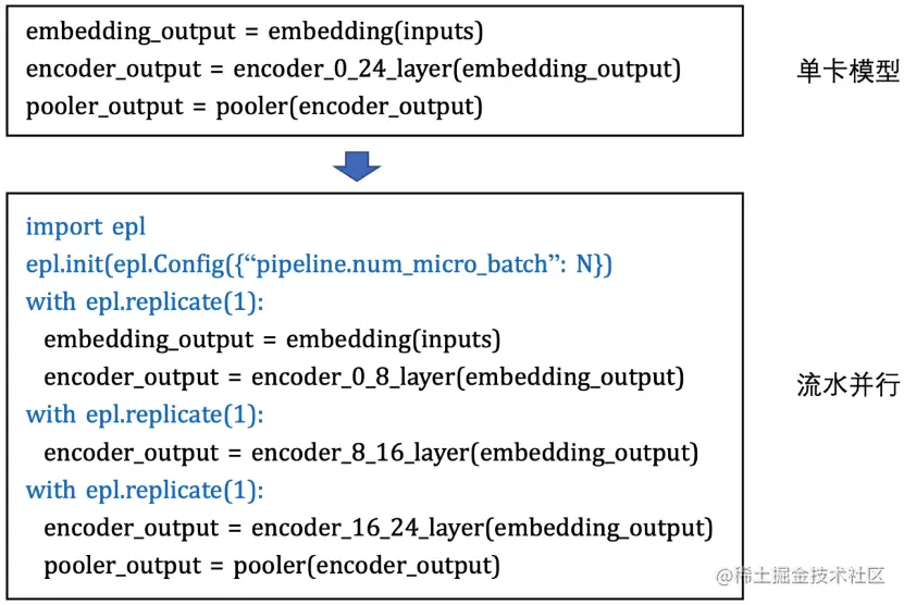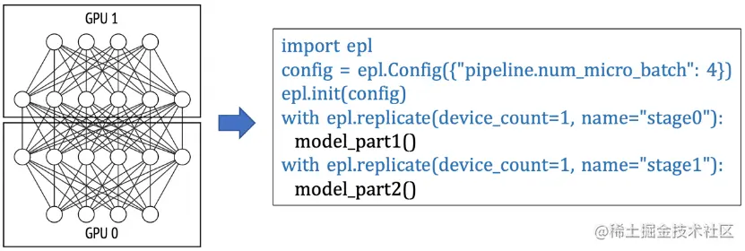 如此,每张卡训练时的显存开销会减少,从而可以增大batch size以提升收敛加速。另外,针对因模型过大、单卡显存无法放下所导致的无法训练的场景,通过Layer间拆分的模型并行方式来进行分布式训练。通过epl.replicate接口可以实现模型的stage划分,同时通过流水并行的执行调度来提升并行化性能,如下图所示: