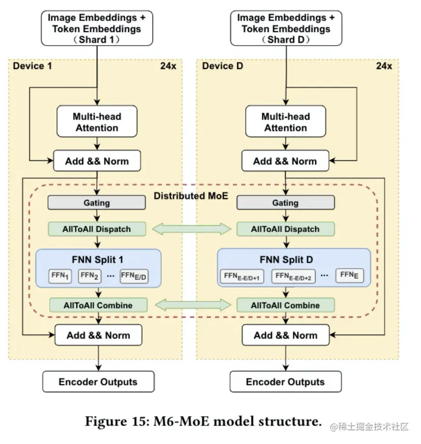 EPL支持专家并行(Expert Parallelism, EP),将experts拆分到多个devices上,降低单个device的显存和算力需求。同时,数据并行有利于提升训练的并发度,因此,采用数据并行+专家并行的混合并行策略来训练M6模型:MoE layer采用专家并行,其他layer采用数据并行。