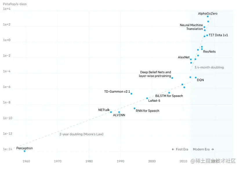 - 2012年以前,模型计算耗时每2年增长一倍,和摩尔定律保持一致;