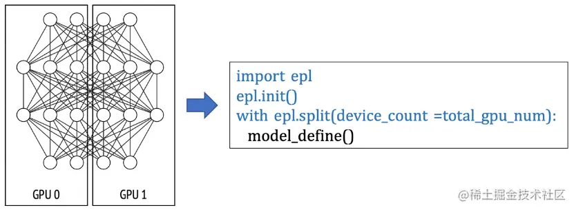 3、算子拆分并行:在以下例子中,EPL会对split scope下的模型定义做拆分,并放置在不同的GPU卡上做并行计算。