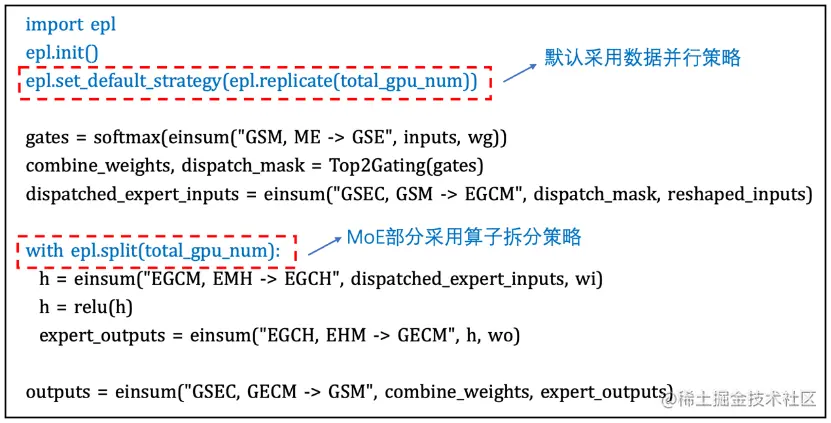 EPL中提供简洁易用的接口来进行模型的混合并行训练,只需要增加几行annotation(注释)来配置并行策略,不需要对模型本身做任何修改。例如,M6模型采用数据并行+专家并行的策略,只需要增加如下图的annotation: