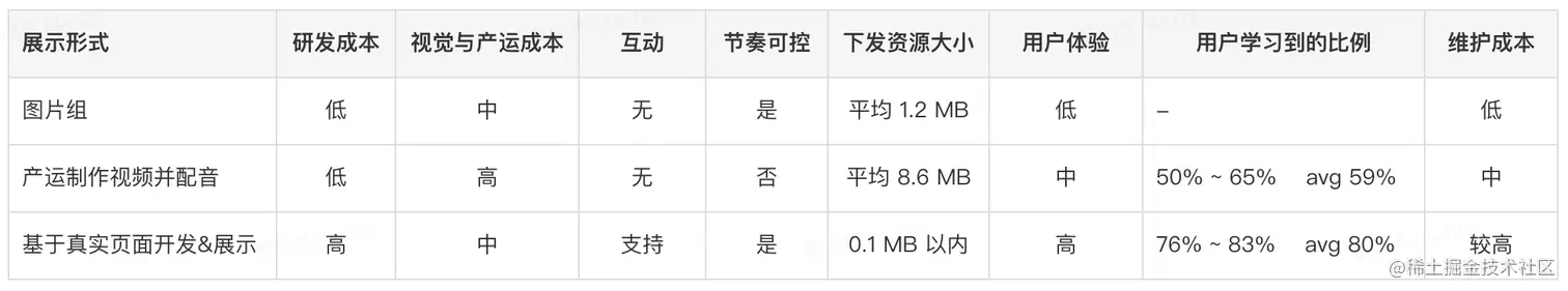 其实,常规的展示形式上还包括图片组,这个基本是强制用户点完才能进入该功能,可以应用于一些建议的引导场景,但对于一些中等复杂度及以上的引导案例,这里的数据就不具备参考意义了。 我们基于一些采集到的数据和基本认知,对以上三类做了一个对比,表格如下:
