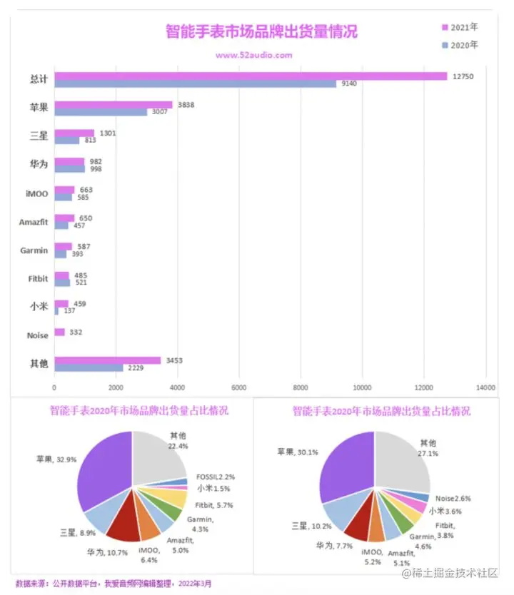 从品牌厂商角度看,目前智能手表领域的主要公司可分为以苹果、三星、小米等代表的智能手机品牌厂商,以佳明、Fibit为代表的运动配件品牌厂商以及以小天才、三六零等为代表的儿童手表品牌厂商。其中,苹果、三星、小米等智能硬件品牌依靠其较为完善的产品生态提高了智能手表在终端消费者中的认可度。
