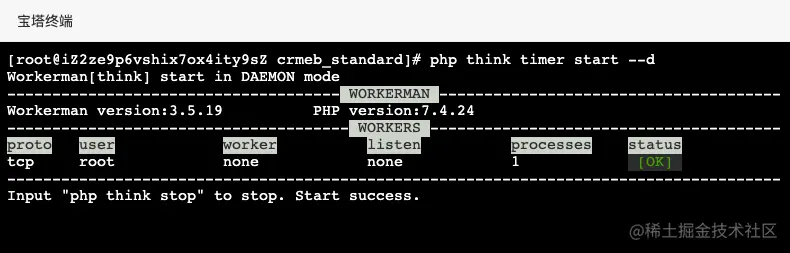 - 命令行执行命令 php think timer start --d