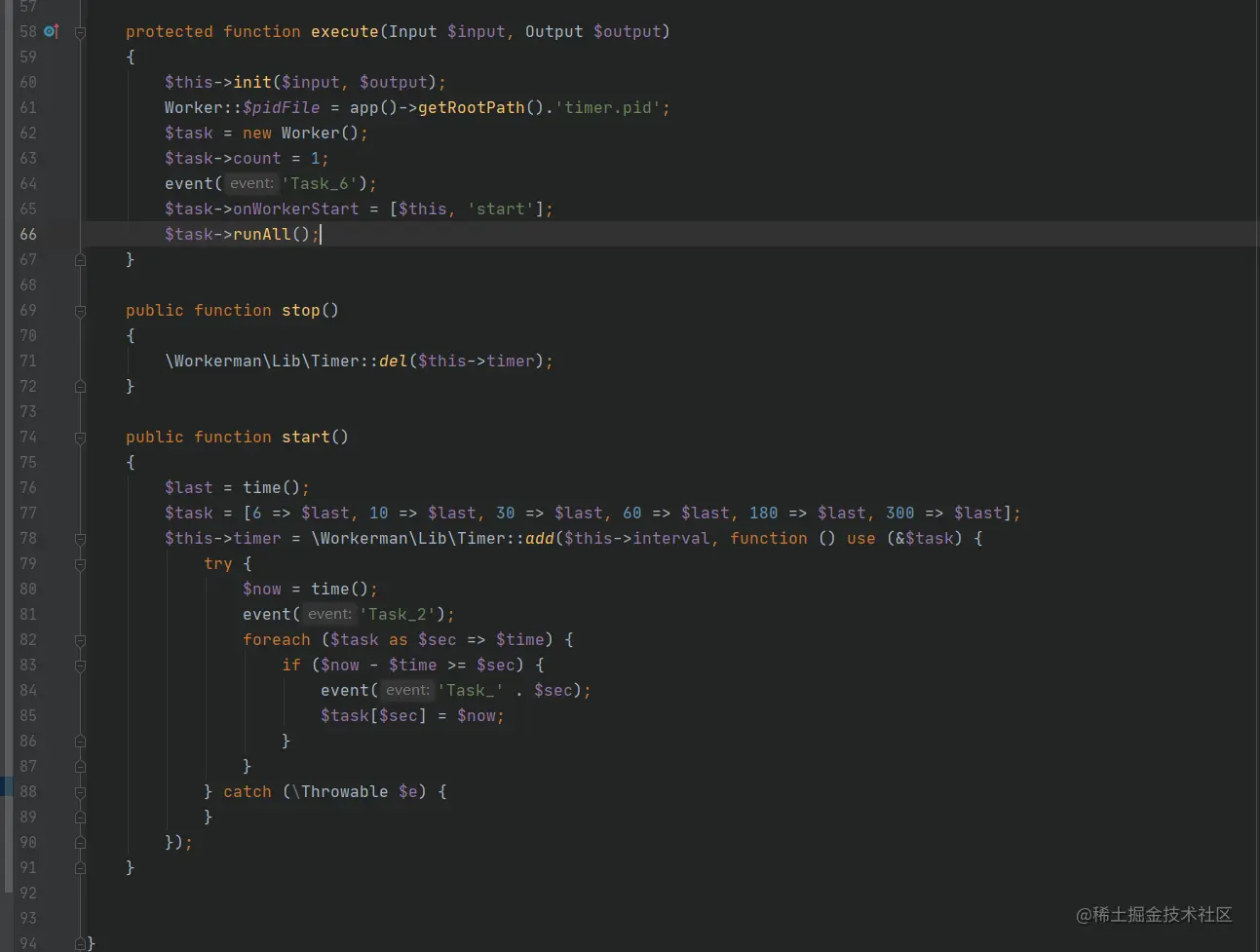 七、start方法开始执行定时执行的逻辑按照设置的间隔时间($this->interval)进行执行,默认2秒运行一次,调用系统中app\event.php文件下定时任务事件订阅类