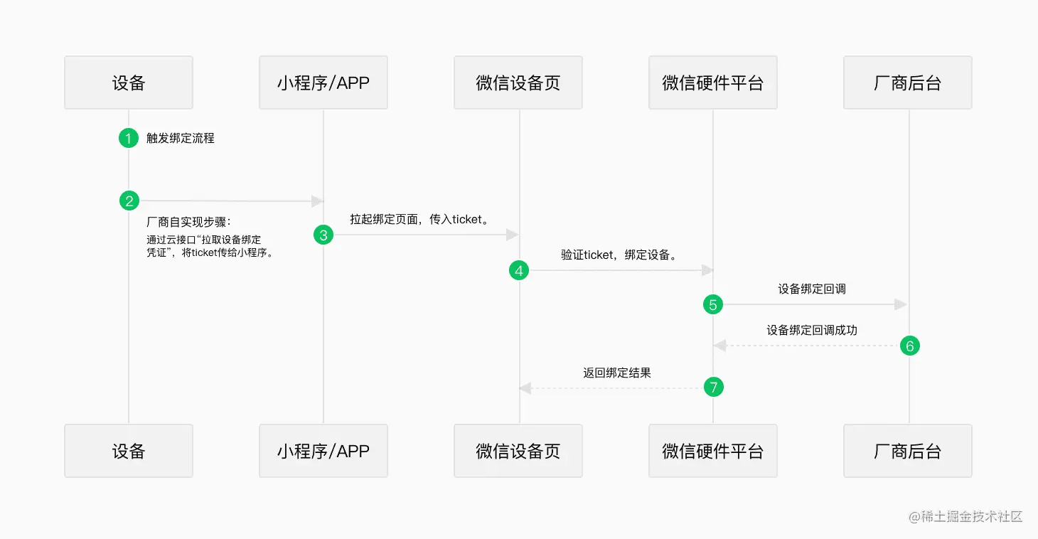 设备绑定时,厂商后台到微信硬件平台拉取该台设备的绑定凭证,传递给小程序端