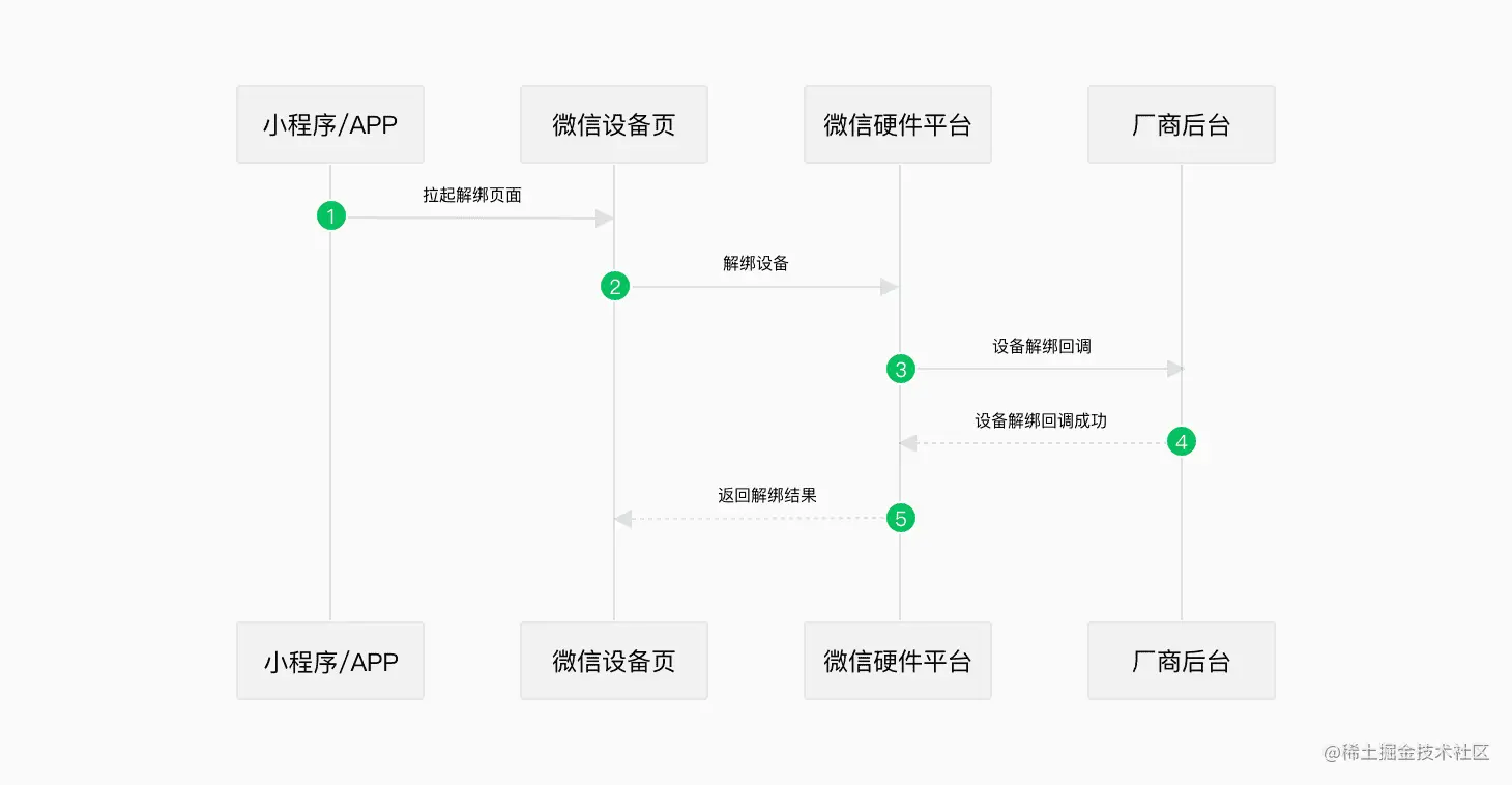 当用户在微信硬件页解绑设备(见下图,无需开发)或小程序管理端解绑设备(这个是需要自己开发页面的)时,厂商可以在解绑回调时进行自己的绑定管理和权限校验.