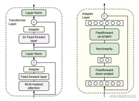 为了在 prompt 与 fine-tuning(微调)方法之间找到一个平衡,adapter 被提了出来。adapter 主要通过在预训练语言模型中添加额外参数的方式适配下游任务,不需要为每一个下游任务都训练一个全新的模型。具体来说,如果我们希望用 BERT 适配一个任务,首先在 BERT 的每一层中添加 adapter,作为特定下游任务的可训练参数,然后将原本 BERT 的参数冻结不进行训练。这样,在具体下游任务微调过程中,只有 adapter 的参数进行了修改,原本属于 BERT 的参数则保持不变。