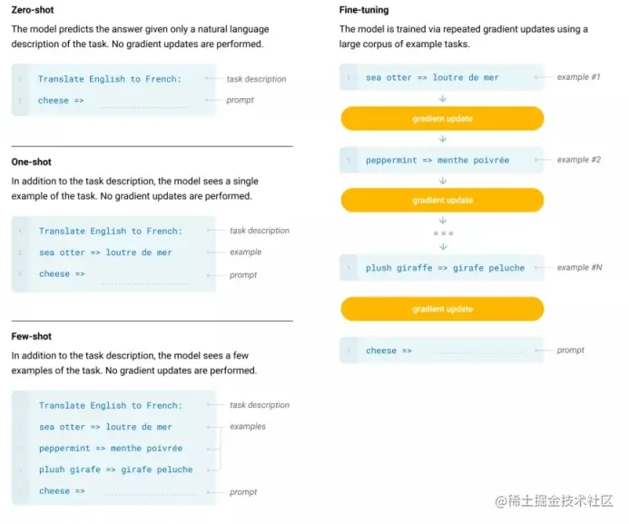 同时,prompt 还能更好地适应 few-shot(小样本),甚至 zero-shot(零样本)的情况。当我们仅给模型输入以自然语言形式的任务描述和示例时,模型依然可以进行预测,而这一过程没有梯度的更新,如下图所示。