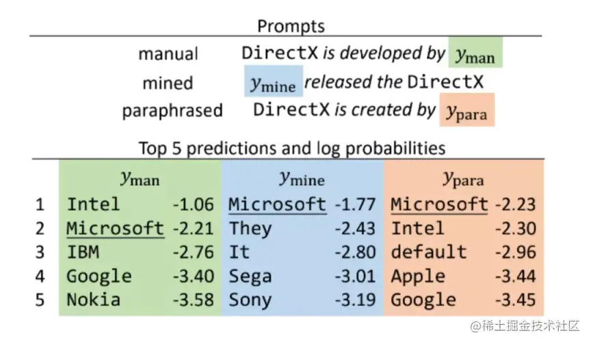 通过选择合适的 prompt,就能控制模型的行为,即控制模型对于可能性最大的词的判断。一个合理的 prompt 是得到正确结果的前提,如下图所示,三种不同的 prompt 虽然语义相似,但是第一个却不能得到正确的结果。通过 prompt,预训练语言模型自身就可以完成下游任务的预测,从而不同下游任务可以共用一个预训练语言模型的参数。