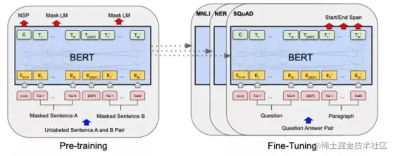 BERT(Bidirectional Encoder Representations from Transformers)的出现,令 NLP 模型的学习方式发生了巨大变化,全监督的方法不再流行,取而代之的方法是预训练(pre-train)与微调(fine-tuning)。