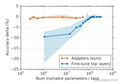 adapter 的具体形式与添加位置可以有多个变种,这里选择最简单的一种进行介绍。如上图所示,adapter 只包含两层全连接层,首先对输入进行下采样,再对下采样后的数据上采样回原始维度,需要注意的是这里还使用了残差连接。BERT 中每层 transformer encoder 添加两个 adapter,分别位于自注意力机制后面与 FFN(feedforward network)后面。这样就构成了一个包含 adapter 的 BERT 模型,可以用于下游任务的微调了。实验证明,adapter 中的参数非常高效:只需要 adapter 中少量的可训练参数,就可以达到 fine-tuning 方式中训练大量参数的效果,如下图所示。