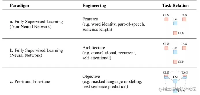 NLP(自然语言处理)模型通常用监督学习的方法训练。监督学习指模型仅在标注好的目标任务数据集上进行训练,由于带标记的样本数量不足以支撑模型学习到高质量的潜在特征,早期的 NLP 模型依赖于特征工程。特征工程指人们根据领域先验知识预先定义特征,这些特征帮助模型具有一定程度的归纳偏置(inductive biases),如下图中 a 所示。