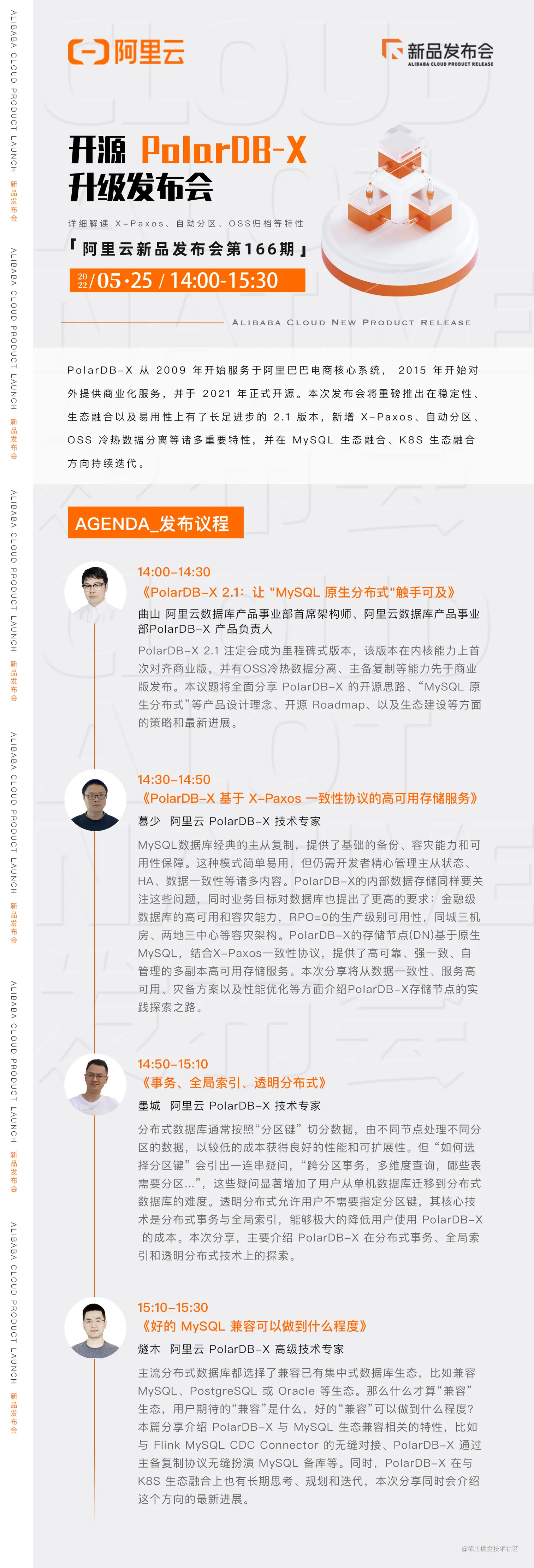 **简介:**2022年5月25日,阿里云开源 PolarDB-X 将升级发布新版本!PolarDB-X 从 2009 年开始服务于阿里巴巴电商核心系统, 2015 年开始对外提供商业化服务,并于 2021 年正式开源。本次发布会将重磅推出在稳定性、生态融合以及易用性上有了长足进步的 2.1 版本,新增 X-Paxos、自动分区、OSS 冷热数据分离等诸多重要特性,并在 MySQL 生态融合、K8S 生态融合方向持续迭代。